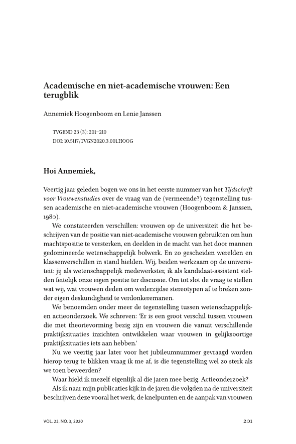 4. Hoogenboom, A. & Janssen, L.(1980). ‘Akademiese en niet-akademiese vrouwen. Over theorievorming voor wie’. Tijdschrift voor vrouwenstudies, 1(1), 109–115.