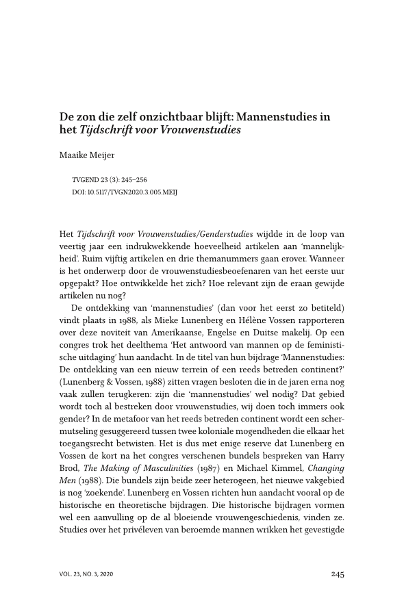 13. Lunenberg, M., & Vossen, H.(1988). Mannenstudies: De ontdekking van een nieuw terrein of een reeds betreden continent?Tijdschrift voor Vrouwenstudies, 9(4), 458–468.
